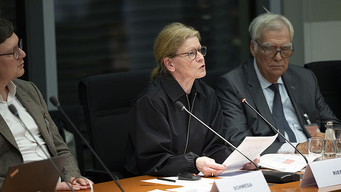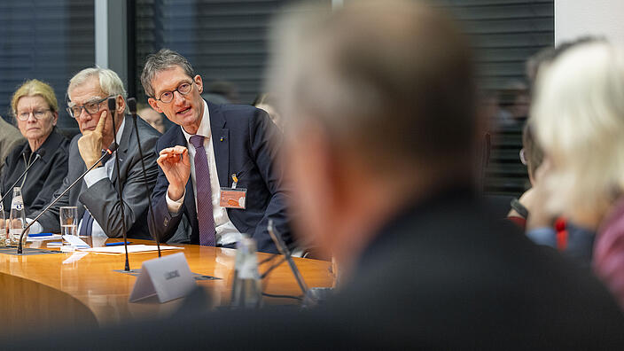 • Der Vorsitzende des Deutschen Ethikrates Helmut Frister mit Bundestagspräsidentin Julia Klöckner im Paul-Löbe-Haus des Deutschen Bundestages